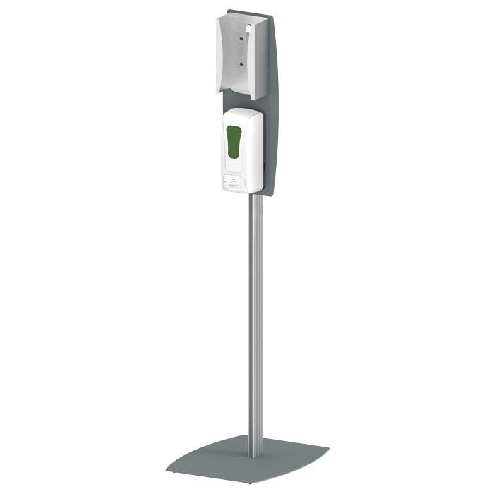 Sensor-Desinfektionsmittelspender 1000 ml, Halter für eine Spenderbox plus Hinweisschild, Standmodell,, 500 x 400 x 1748 mm (L x B x H), pulverbeschichtetes Stahlblech / Aluminium