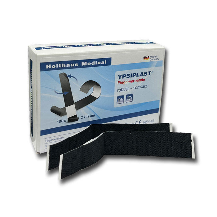 Elastische, schwarze Fingerverbände mit extra starker Klebkraft. Jedes Pflaster ist einzeln eingesiegelt Packung mit 100 Pflastern, 2 x 12 cm